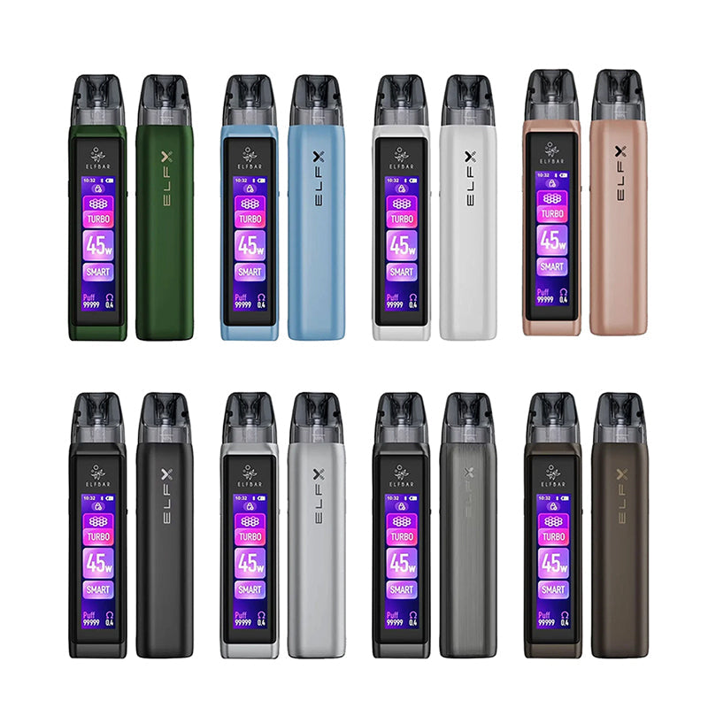 The Elf Bar Elfx Ultra pod kit is an upgrade to the Elfx Pro device. It's perfect for both seasoned vapers and beginners alike since it's simple to use. Powered by a 1500mAh built-in battery and offering a 5-45W variable output, its 2A current means it only takes 45 minutes to be fully charged. Compatible with the full range of Elfx replacement pods, this kit supports MTL (Mouth To Lung), RDTL (Restricted Direct To Lung) and DTL (Direct To Lung) vape styles. It comes equipped with two Elfx pods in 0.6 Ohm and 0.8 Ohms to get you started. With a color touchscreen display, the Elfx Ultra lets you navigate through settings and vaping modes quickly. For a hands off approach, stick with Smart Mode and it'll detect the resistance of your chosen pod, setting the best wattage to vape at. Inhale on the mouthpiece to vape and depending on which pod you've chosen, you'll experience a discreet amount of vapor that feels like a cigarette, or something airier for an RDTL or DTL vape. For more customization, adjust the airflow slider to change how tight or loose each inhale feels.