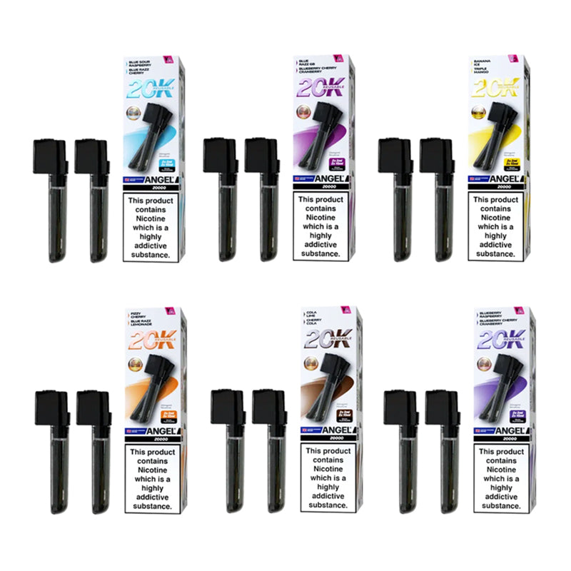 Vape Bars Angel 20K Prefilled Replacement Pods offer a convenient and reliable solution for maintaining your Vape Bars device. Each pod is prefilled with high-quality e-liquid, ensuring consistent flavor and vapor production. Designed for easy installation and optimal performance, these replacement pods help you enjoy a smooth vaping experience without the hassle of refilling. The Vapes Bars Angel 20K Prefilled Vape Pods are specifically made for use with the Angel Bar 20K kit, providing a convenient and high-capacity refill option. The prefilled pod and container pack includes 2 x 2ml pods and 2 x 10ml refill containers, each filled with different Vapes Bars nic salt e-liquids in a 2% (20mg) nicotine strength.